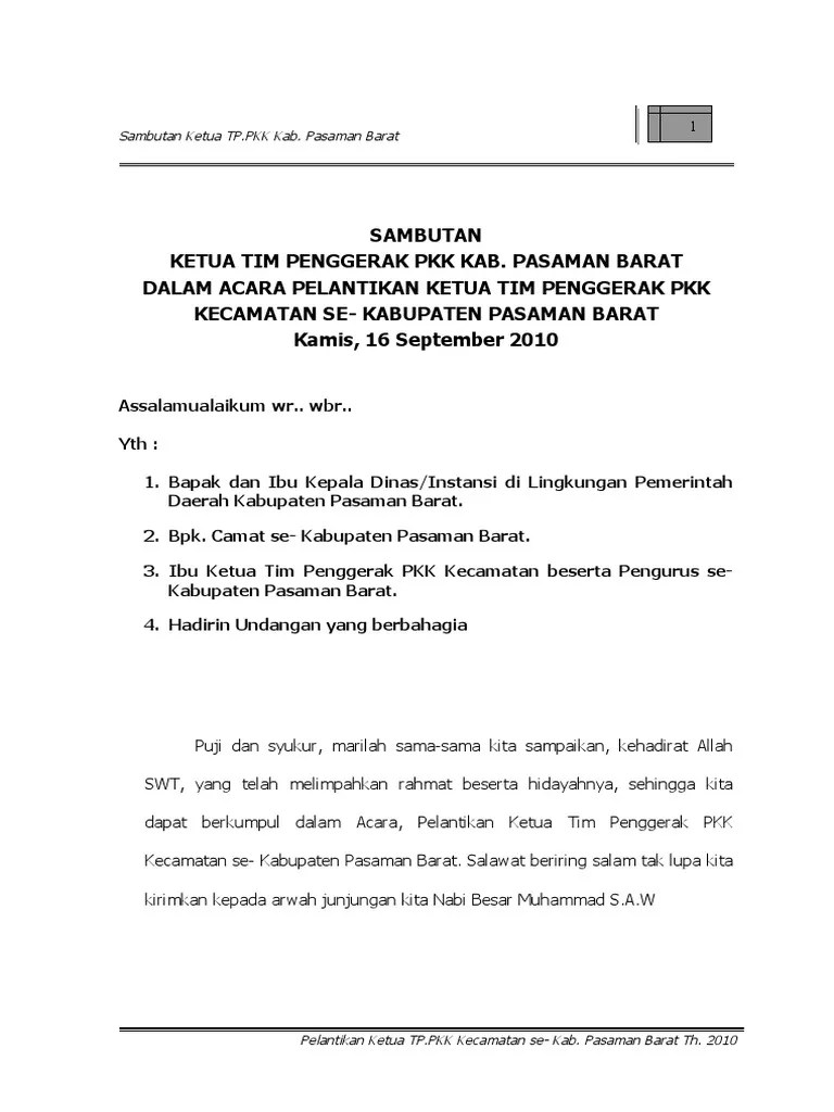 Ketua dawis yang ditunjuk ini sebaiknya dapat bertindak motivator dan komunikator . Sambutan tuan rumah wood scribd indo. Puji syukur kehadirat allah swt, yang senantiasa memberikan rahmat dan karunia kepada setiap hambanya . Puji dan syukur patutlah dipanjatkan kepada tuhan yang maha kuasa yang telah memberikan . Contoh naskah sambutan ketua pertemuan rutin pkk muda mudi.