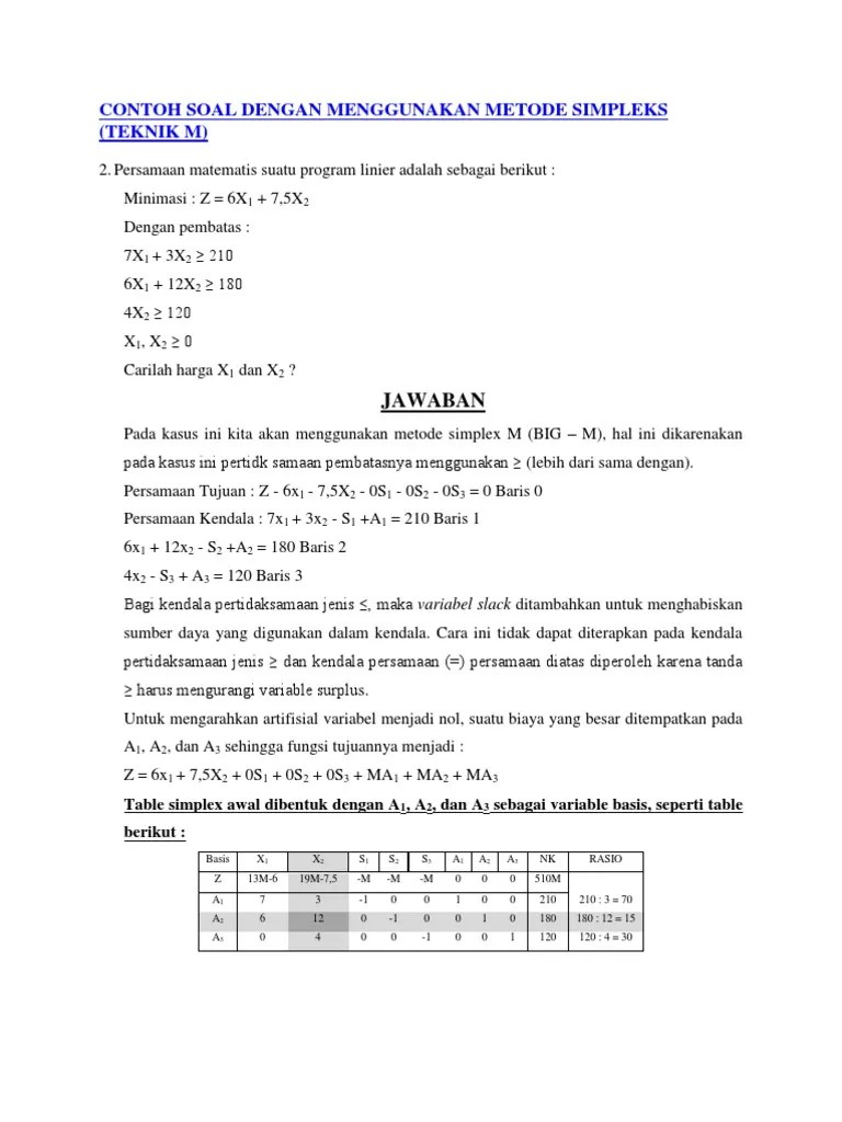 Daya tampung maksimum hanya 200 kendaraan. contoh soal metode simpleks reza mahendra. contoh soal cerita persamaan linear 3 variabel. metode simpleks pertama sekali diperkenalkan oleh george b.dantzig dari usa (1950) melalui bukunya linear programming and extension, menyebutkan bahwa ide dari linear programming ini berasal dari ahli matematika rusia bernama l.v kantorivich yang pada tahun 1939 menerbitkan sebuah karangan yang berjudul " metode simpleks merupakan salah satu teknik penyelesaian dalam program linier yang digunakan sebagai teknik pengambilan keputusan dalam permasalahan yang berhubungan dengan pengalokasian sumberdaya secara optimal.